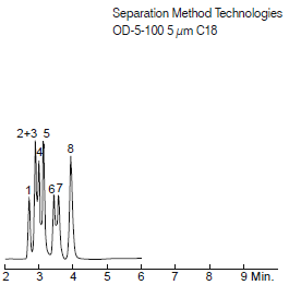 | The separation of nine caffeine metabolites, each a geostereoisomer of similar structure, demonstrates the resolving power for positional isomers. The Spursil™ C18 column completes this separation in less than 13 minutes, with remarkable selectivity. | |||||||||||||||||||||||||||||||||||||